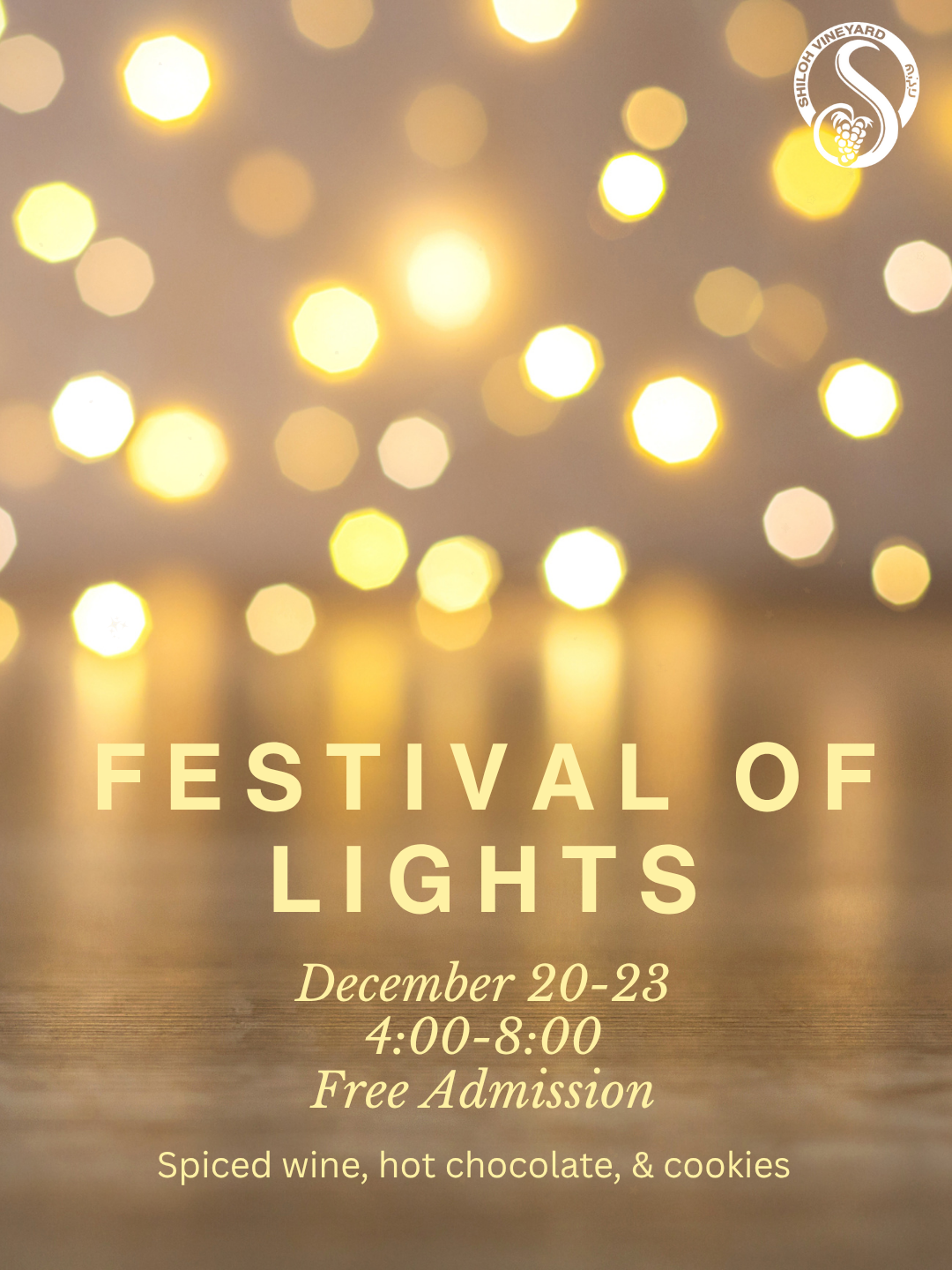 Bring out the family to enjoy a festive evening at Shiloh! Our annual Festival of Lights will take place this year on December 20, 21, 22, and 23 from 4-8 pm. Come and go and enjoy some cookies, hot chocolate, and spiced wine! Make plans to join us for one night or all 4!