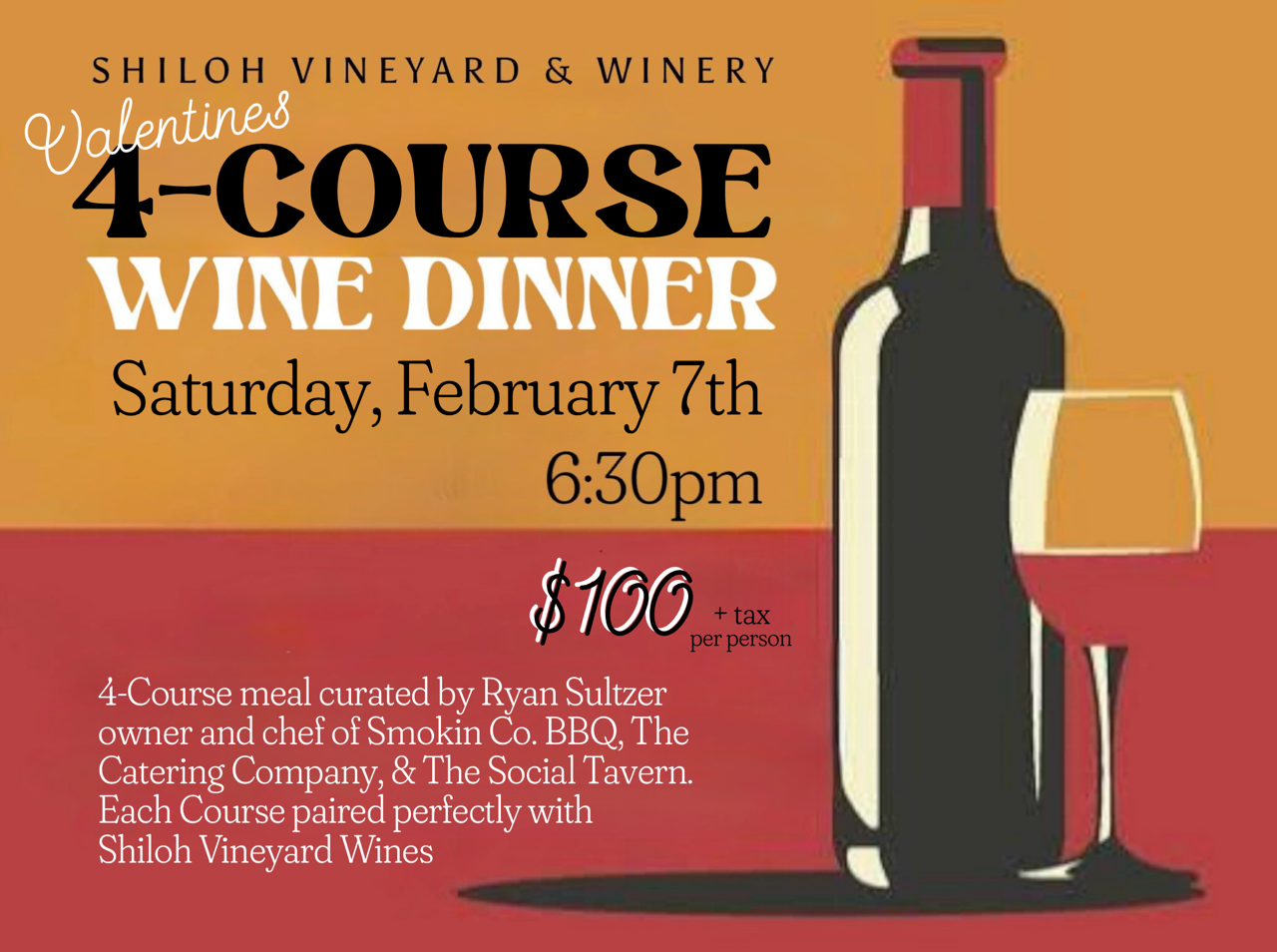 Join us for an unforgettable evening at Shiloh Vineyard, where exceptional wines meet culinary excellence in a carefully curated four-course dining experience!